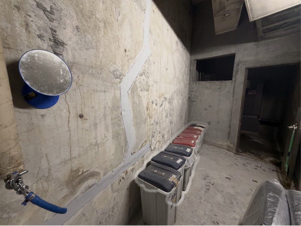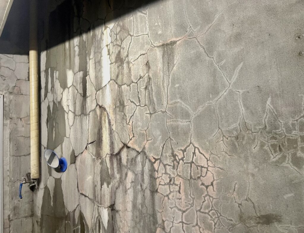 床には水がたまり 壁面はひび割れや白華が進行…。調査にも長靴が欲しいほどでした、、