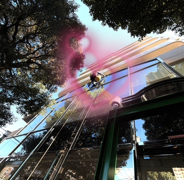 カーテンウォールなので 仮設足場を設置しようとすると 足場の控え(壁繋ぎ)が取れないので 難しい工法になってしまうのと 加えて ”お高い金額”になってしまったので ブランコでの補修を選択